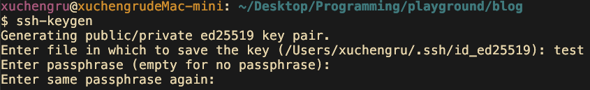 會問你要把keygen存在哪,預設 ~/.ssh/,然後問你要不要passphrase,直接enter就好
