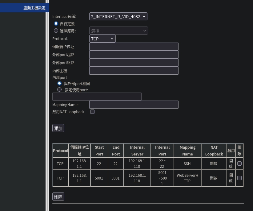 到進階頁面 -> Advanced NAT下面的虛擬主機設定